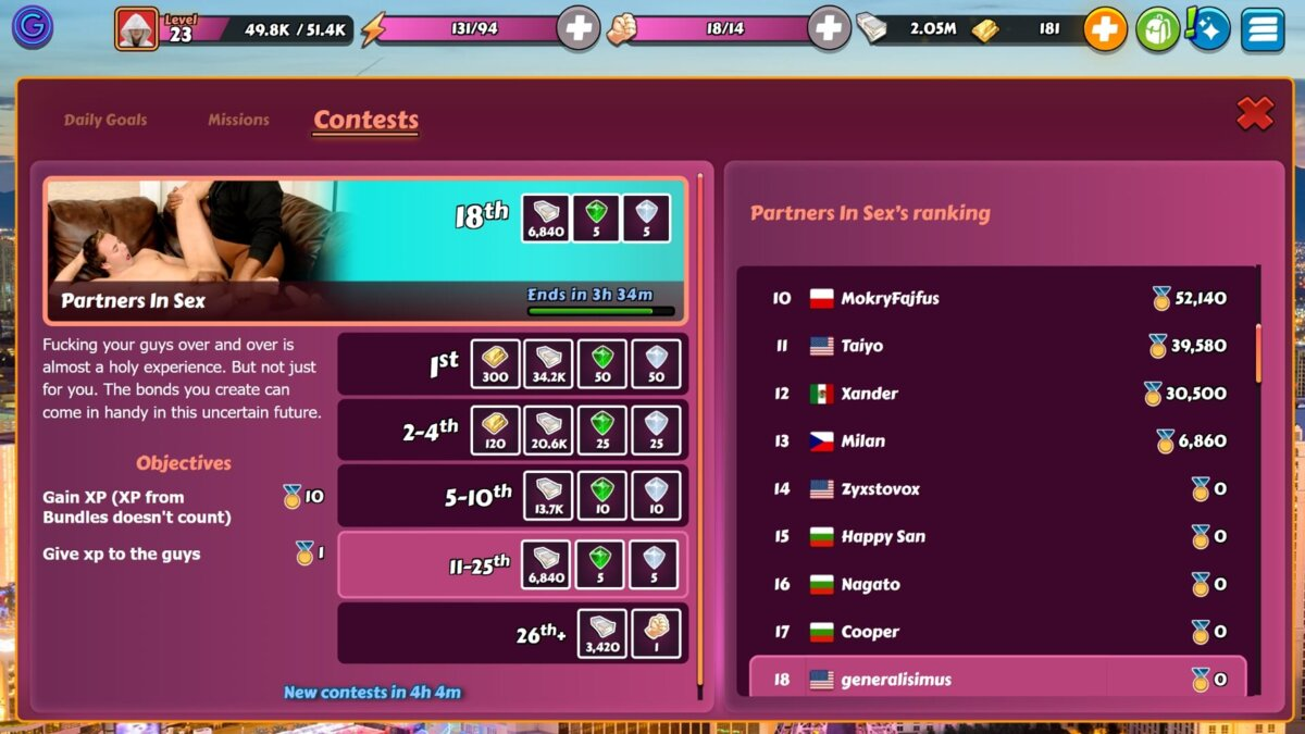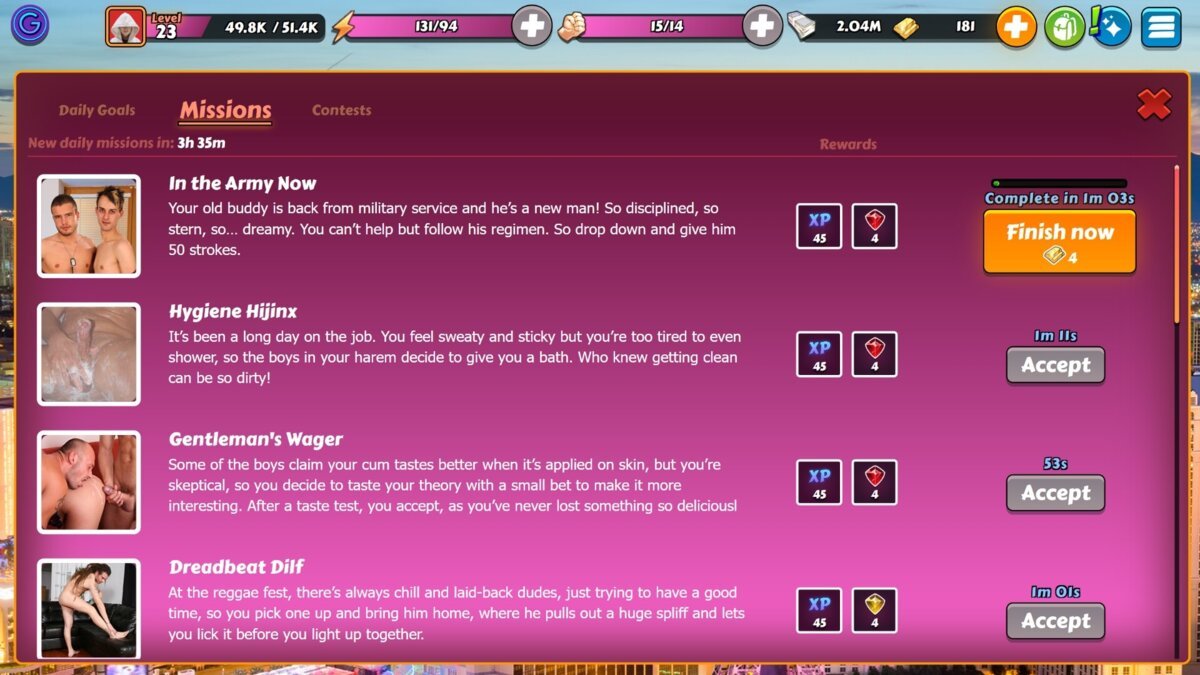 Gameplay revolves around completing story-driven quests and missions, each packed with gay sex scenes featuring realistic graphics and varied sexual scenarios. As you progress, you unlock and recruit real-life gay pornstars to join your harem, bringing actual adult industry faces into the game.